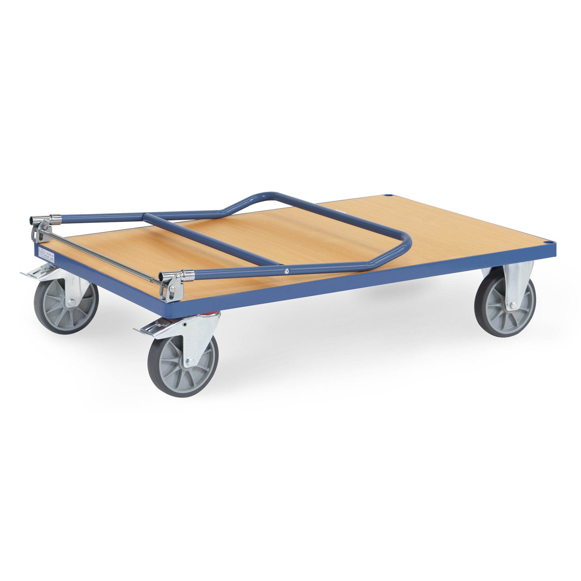 Ladefläche aus Holzwerkstoffplatte, Oberfläche Buchendekor. 2 Lenk- und 2 Bockrollen. Naben mit Rillenkugellager. Feststeller an den Lenkrollen.
